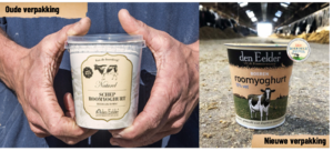 De boeren roomyoghurt was aan de beurt om een andere verpakking te krijgen die helemaal past binnen de nieuwe stijl van Den Eelder. Duurzaamheid staat bij ons hoog in het vaandel en wij blijven daarom op zoek naar nieuwe manieren om de verpakking te verduurzamen. De wikkel daaromheen is gemaakt van gerecycled papier waardoor de hele verpakking recyclebaar is. Er is daarom ook besloten om afscheid te nemen van de drukdeksel om het gebruik van plastic te reduceren, de beker zal afgesloten worden door middel van een seal. Gelukkig is de inhoud van de beker onveranderd (400 gram heerlijke romige yoghurt) en behoudt hij de vertrouwde receptuur.