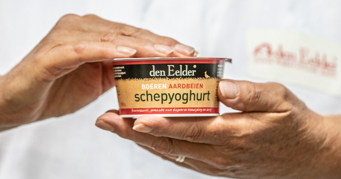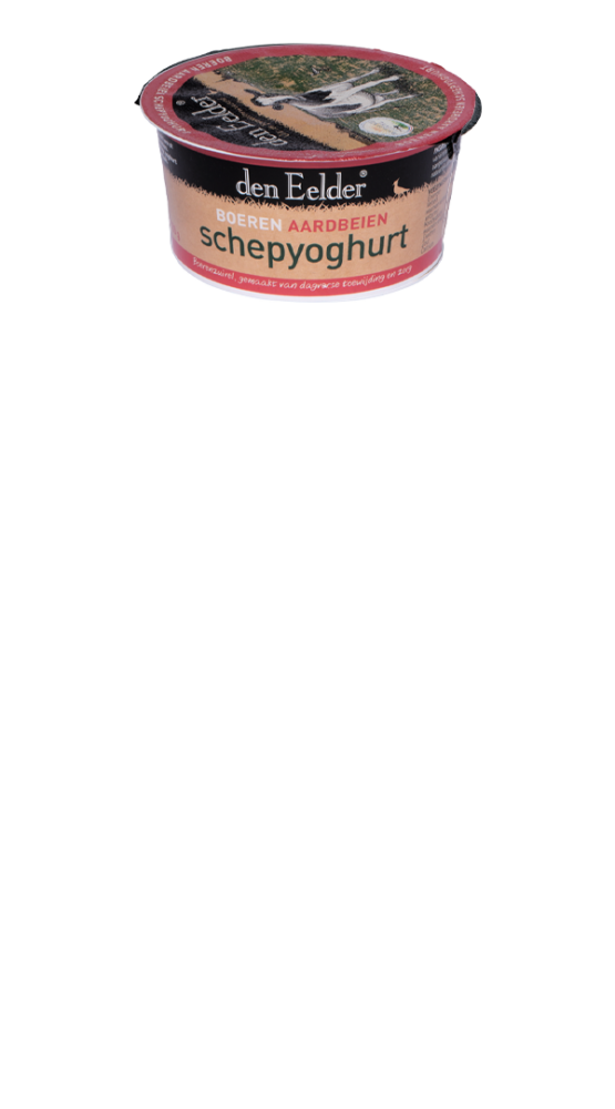 Den Eelder aardbeienyoghurt is gemaakt van volle gepasteuriseerde koemelk met natuurlijk aardbeiensap en een flinke dosis liefde. Ingrediënten: volle koemelk, bietensuiker, aardbeien sap en een vleugje bietenrood. Het is alleen verkrijgbaar bij bedrijfsrestaurants, food services en de groothandel in 1-persoonsporties van 150 gram.