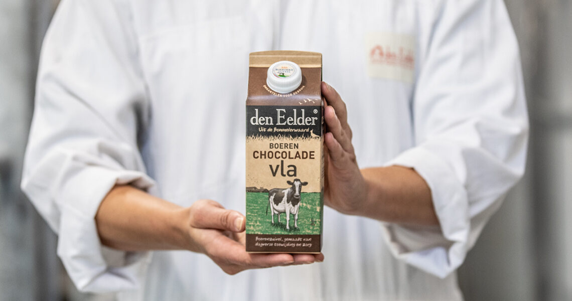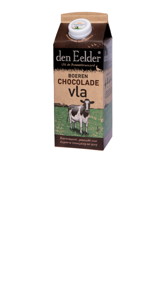 Den Eelder Boeren chocoladevla maken we met eersteklas cacao. Hij is vast een stuk dikker en voller dan je gewend bent. Hij “blobbert” net als onze vanillevla echt uit de verpakking en dát is precies de bedoeling. Zo mooi dik en romig is onze chocoladevla op zijn allerlekkerst! Sluit een maaltijd af met een kommetje chocoladevla en geniet.