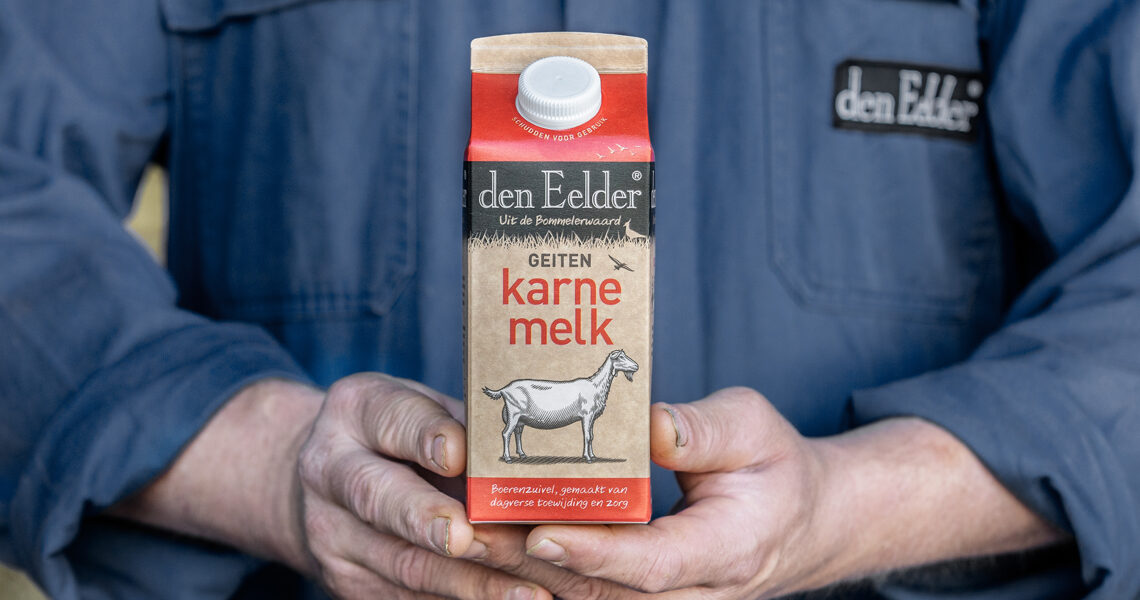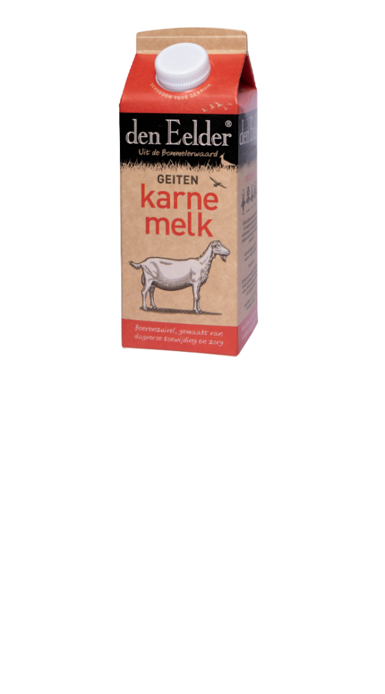 Den Eelder Geitenkarnemelk wordt gemaakt van dagverse volle gepasteuriseerde geitenmelk en bevat slechts 0,5 gram vet per 100 ml. Het is verkrijgbaar in een kartonnen verpakking van 750 ml.