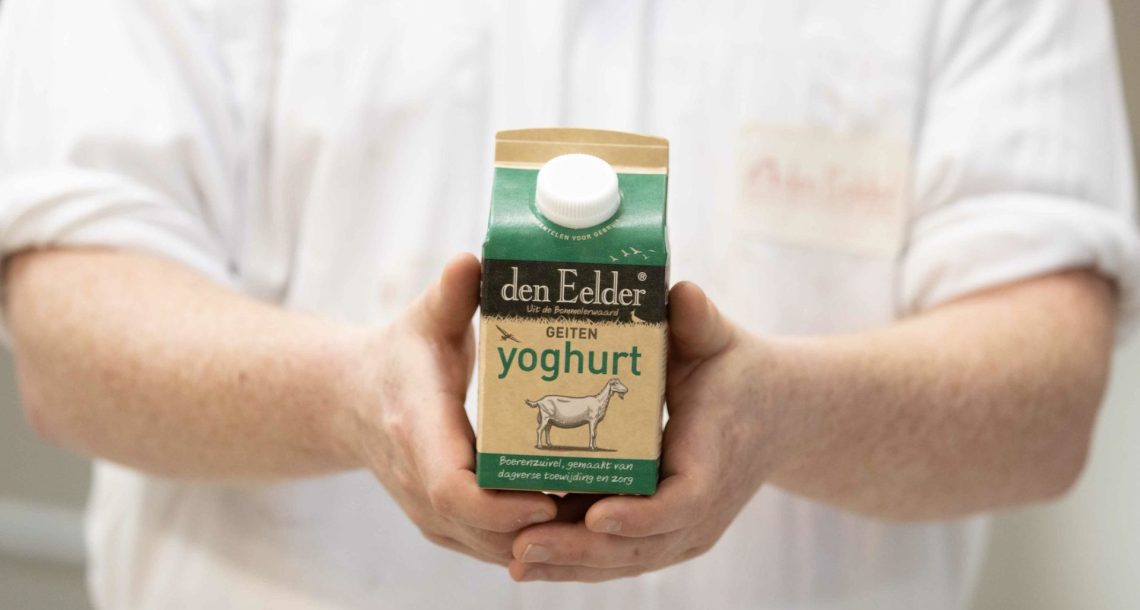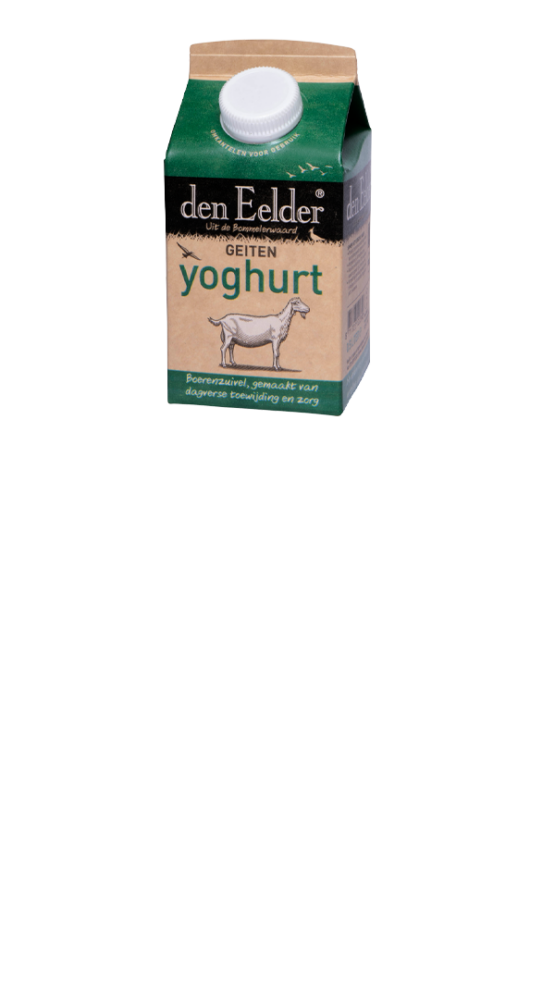 Den Eelder Geitenyoghurt wordt gemaakt van dagverse volle gepasteuriseerde geitenmelk, aangezuurd met een mild yoghurtzuursel en een flinke dosis liefde. Het heeft een natuurlijk vetgehalte variërend tussen 3.4% en 4.3% (afhankelijk van het seizoen). Het is verkrijgbaar in een kartonnen verpakking van ½ liter.