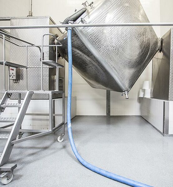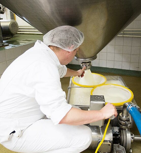 2. Dan gaat de melk op fermentatietemperatuur de karnemelktank in. Hier zuren we de melk aan met karnemelk melkzuurbacteriën.